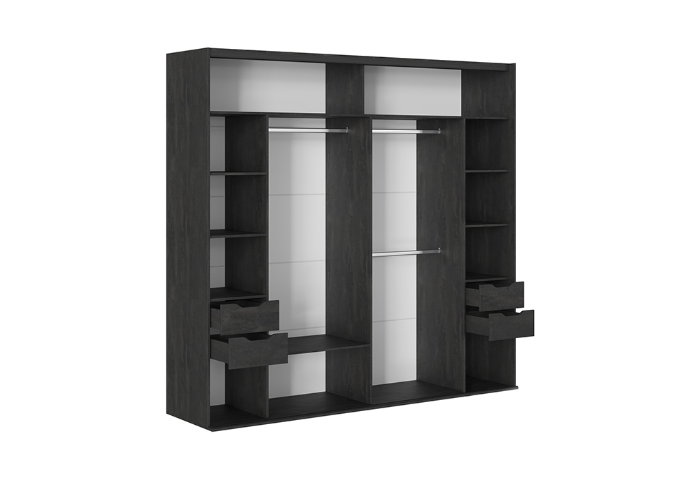 В шкафу присутствуют ниши для хранения одежды и обуви: Верхняя часть поделена на 2 отсека габаритом Д.1226 х В.375 х Г.554 мм. Нижняя часть шкафа состоит из 4 отсеков, два из которых расположены по центру и предназначены для расположения одежды на вешалках-плечиках. Габарит данных отсеков Д.795 х В.1940 х Г.554 мм. В левом отсеке 2 штанги металлические (расстояние до нижней штанги - 965 мм, от нижней до верхней – 848 мм), в правом – 1 штанга и полка несъемная (ниша под полкой Д.795 х В392 х Г.554 мм, расстояние от полки до штанги – 1427 мм). Два отсека, расположенные по правую и левую стороны от центральных, включают в себя по 2 ящика на направляющих скрытого монтажа, длиной 450 мм. Фасады ящиков (188х409 мм) имеют отфрезерованную выемку заменяющую ручку. Внутреннее пространство ящиков Д.375 х В.96 х Г.434 мм. Механизм выдвижения ящика: направляющие на 450 мм скрытого монтажа 3/4 (Cubo) 658-3045. Максимальная нагрузка на ящик: 35 кг равномерно-распределенной массы. Над ящиками расположены по 3 полки (размер ниш Д.415 х В.375 х Г.554 мм), под ящиками отсек габаритом Д.415 х В.392 х Г.554 мм. Профили системы Аристо Nova со скрытой установкой верхнего трека в корпусе, цвет черный матовый. К верхней вязке крепится верхняя направляющая длиной 2568 мм. На нижнюю крышу крепят нижнюю 2х-полозную направляющую, с установленным в пазы уплотнителем, длиной 2566 мм. Фасад шкафа-купе состоит из 2х створок, каждая из которых включает в себя 5 сегментов (верхних / нижних сегментов – 2 шт., средних сегментов – 3 шт.). Каждый сегмент собирают на производстве из 1250х675 Лакобель с защитной пленкой и Nova профиль рамы под стекло широкий (Д.1175), Nova профиль рамы под стекло узкий (Д.1175), Nova профиль рамы под стекло узкий (Д.460). Закрепляют на сегменте Nova рамку горизонтальную узкую, цвет черный матовый (Д.1246) в указанном месте. У шкафа-купе видимые боковины разной глубины, за выступающим вперед фасадом глубина боковины 621 мм, за утопленным фасадом бок 582 мм. При сборке можно выбирать какая дверь будет выступать вперед и ставить боковины соответствующим образом. Задняя стенка шкафа ЛХДФ белого цвета в паз, состоит из 10 частей. |