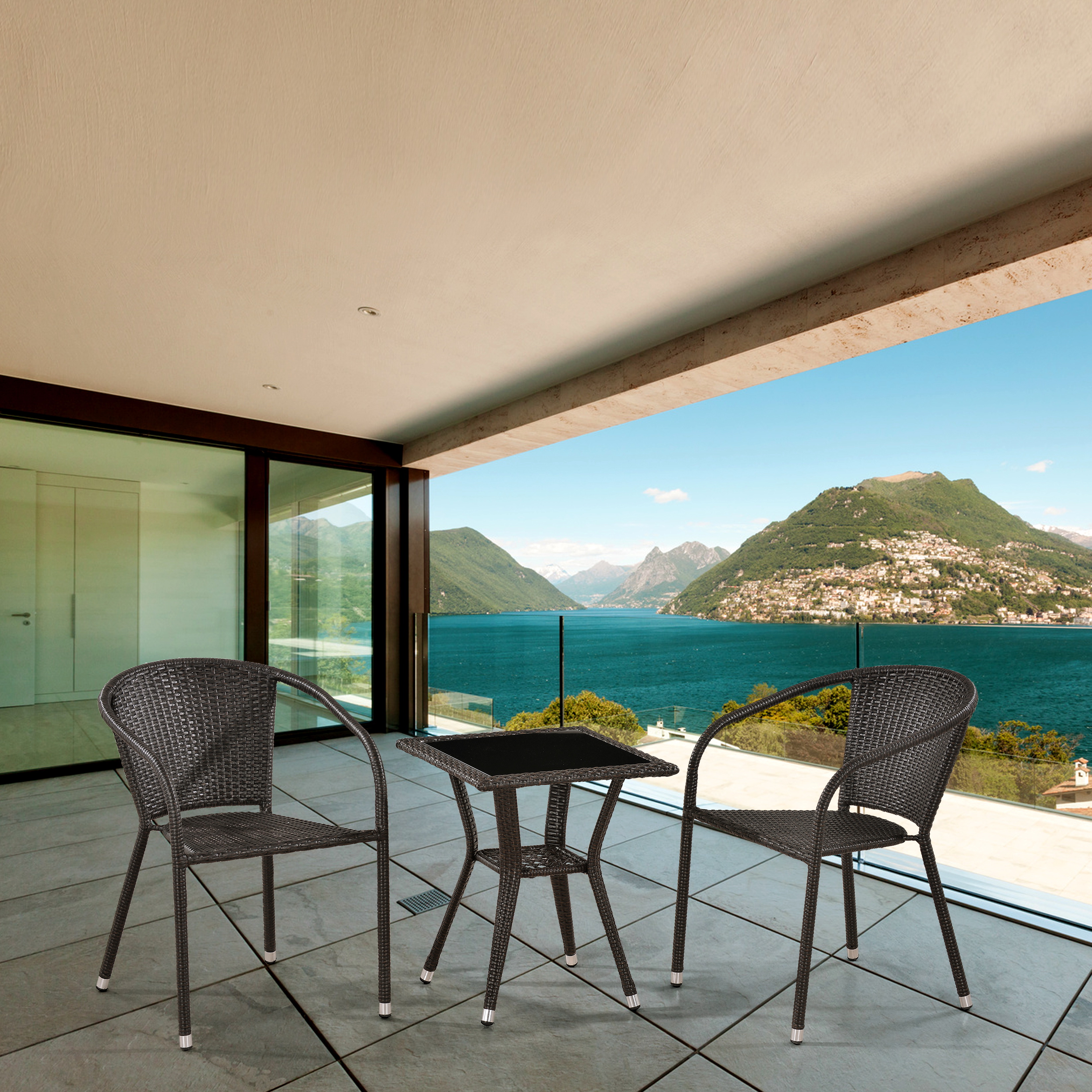 Стол: D50х50хH60 см. Стекло: закаленное- 5мм. стекло внутри столешницы, цвет - черный Кресло: W58xD60xH78 см. Каркас: сталь. Материал:искусственный ротанг Цвет: Brown. Объем: кресло - 0,3,стол - 0,02.
